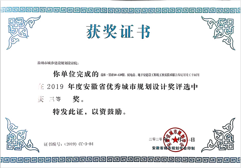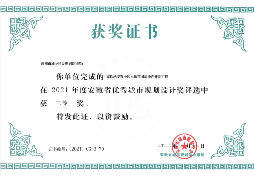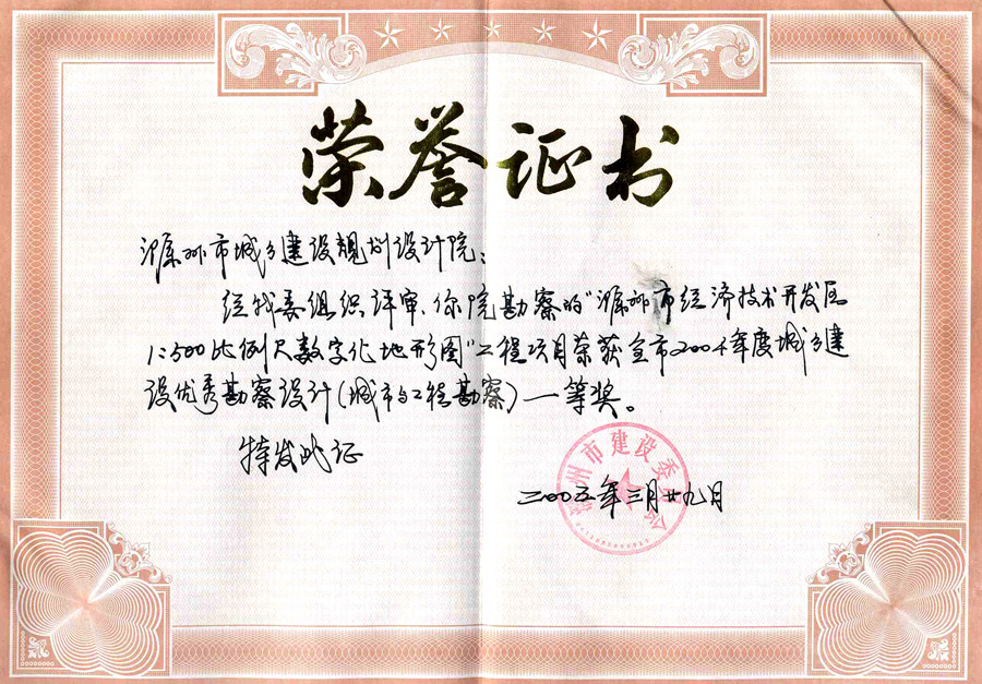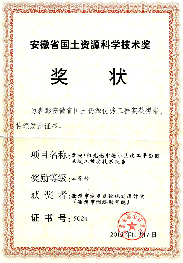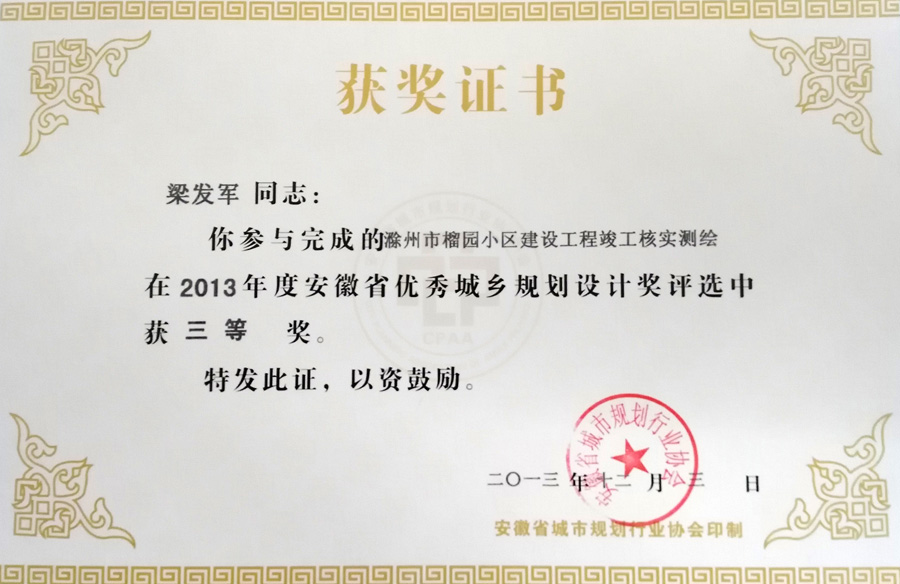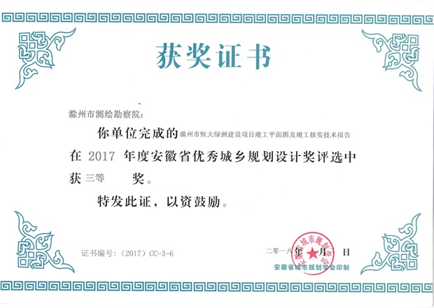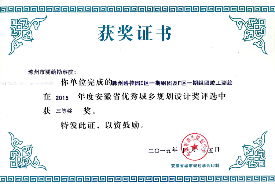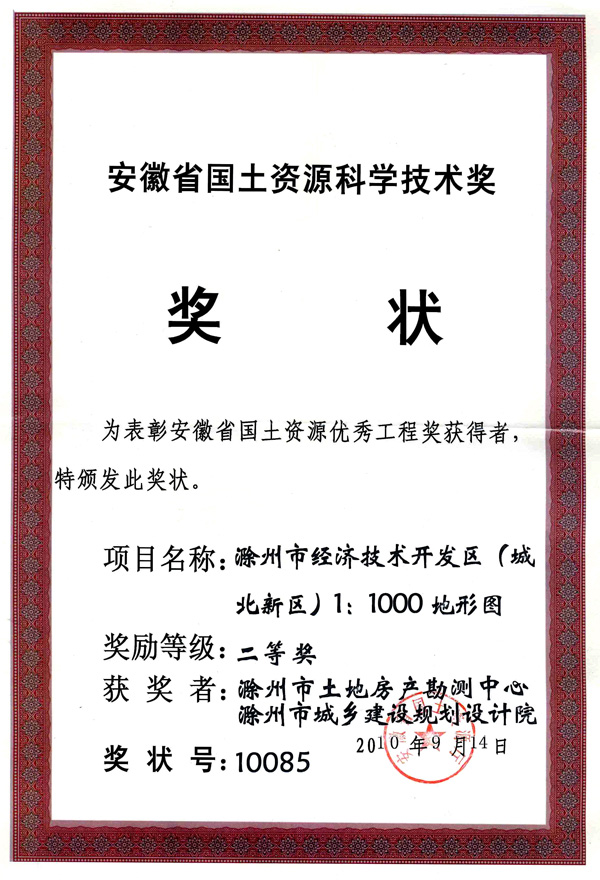滁州市經(jīng)開(kāi)區(qū)地形圖測(cè)繪規(guī)劃獲獎(jiǎng)證書
